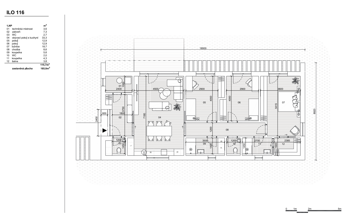 Příčně orientovaný obývací pokoj od sebe pomyslně odděluje denní část dispozice od zadní soukromé části domu. Ze třech stran je dům lemován prostou omítkou, zahradní terasa je doplněná dřevěným obkladem nebo silikonovou omítkou v dekoru dřeva pro zvýšení pocitu útulnosti. Kryje jí zároveň přesah střechy, který především napomáhá proti přehřívání interiéru v letních měsících.