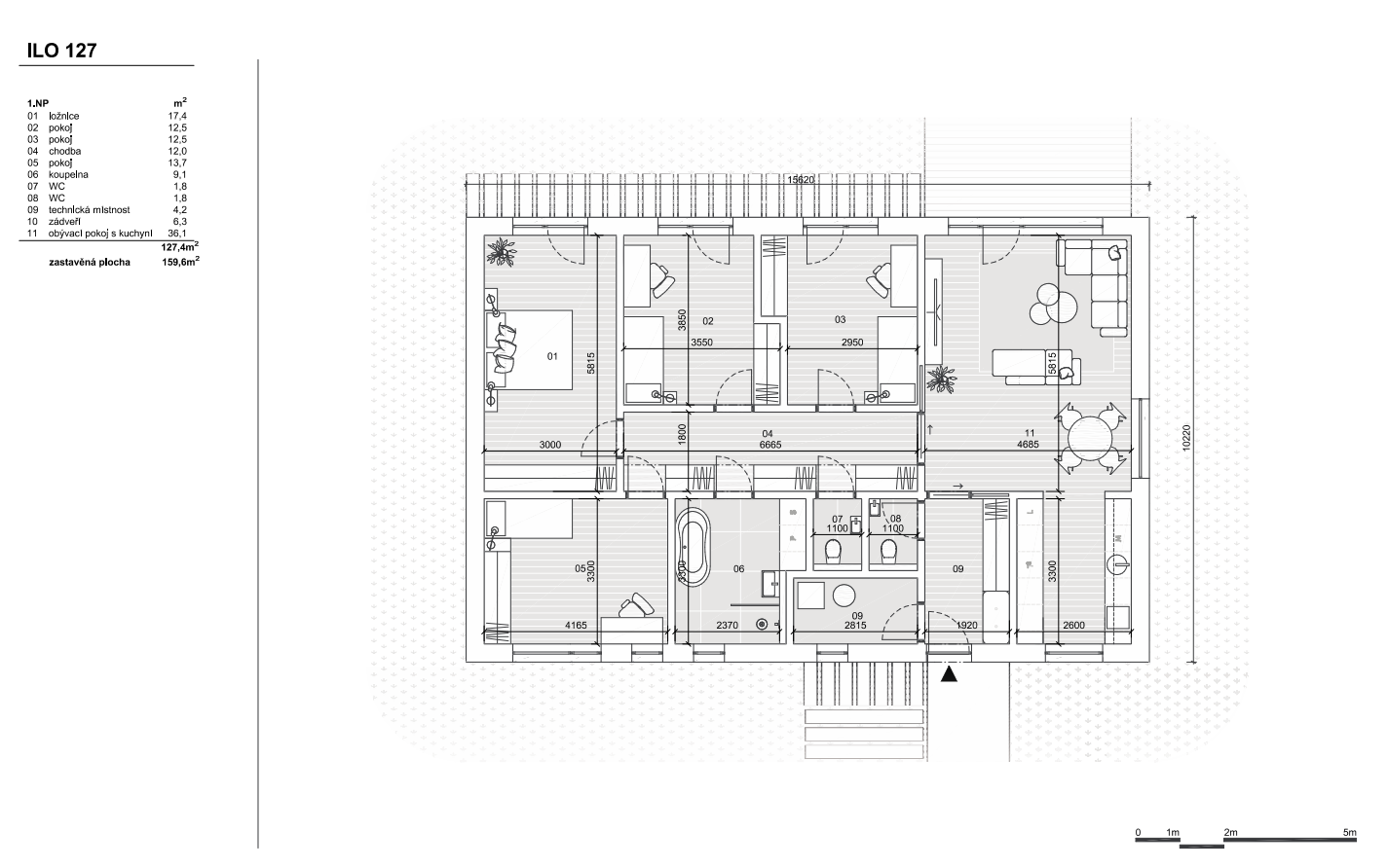 Dům ILO 127 nabízí tradiční dispozici přetvořenou do podoby centrální chodby, která je rozšířena a může zároveň fungovat jako šatna. Příčný obytný prostor je členěn na společenskou část a mírně oddělené kuchyňské zákoutí. Jeden boční štít je záměrně slepý, aby bylo umožněno osazení na co nejužší pozemek. V případě potřeby je možné limitovat i prosklení do druhého štítu. Exteriér domu kombinuje dřevěný obklad nebo silikonovou omítku v dekoru dřeva a běžnou omítku. Použití dřevěných latí umožňuje elegantní řešení vstupní fasády.
