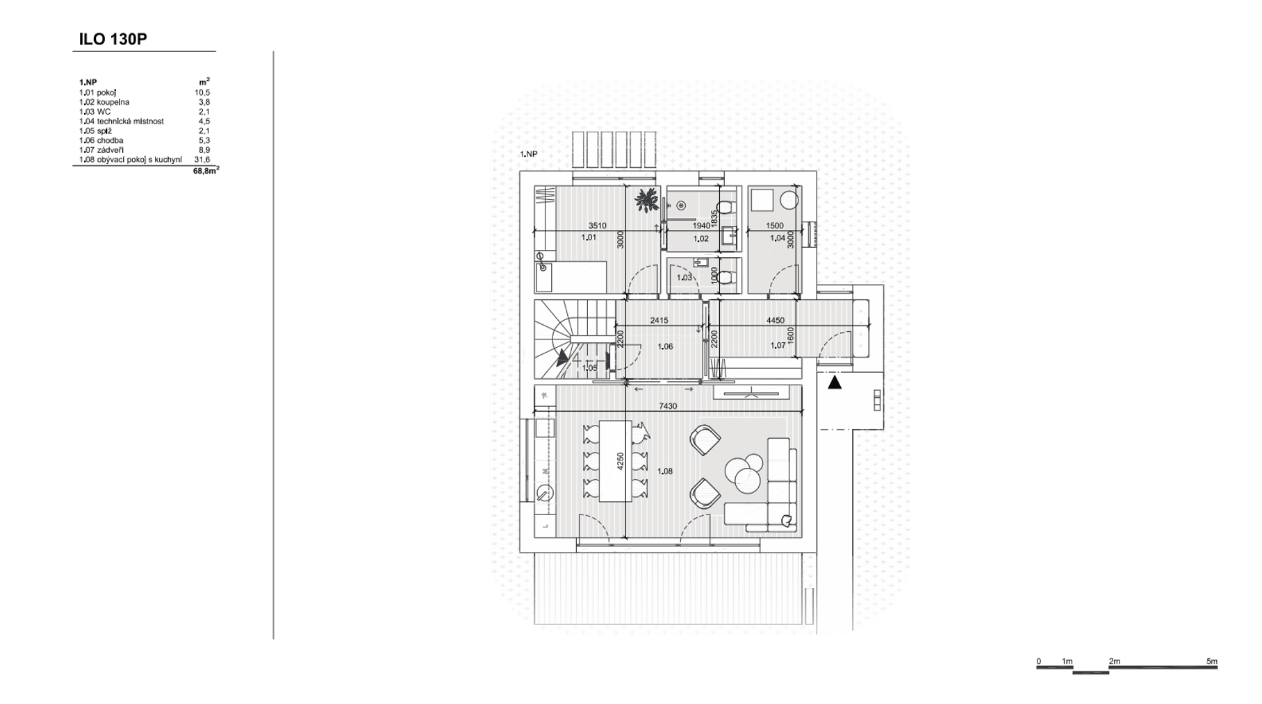 Tradiční dům se sedlovou střechou nabízí prostorný interiér na minimální zastavěné ploše a především na pozemku minimální šíře. Obytná část je situovaná do zahrady, směrem k cestě je orientováno obslužné zázemí. V patře navazují pokoje na centrální chodbu, která je otevřena do krovu pro větší vzdušnost. Exteriér domu kombinuje dřevěný obklad nebo silikonovou omítku v dekoru dřeva lemující přízemí a klasickou omítku. Tato barevnost navazuje na střešní krytinu a vytváří tak osobitý vzhled domu.