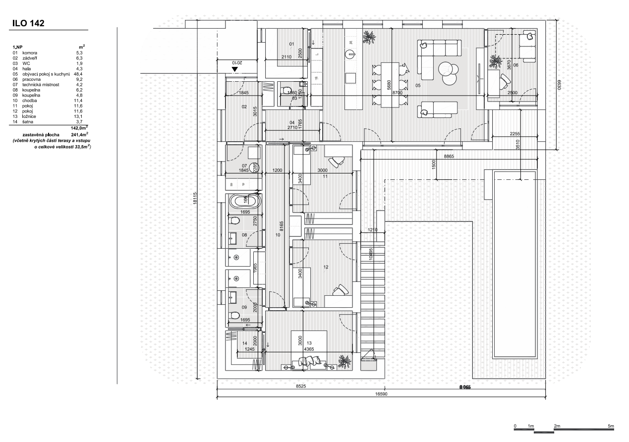 Dům s půdorysem ve tvaru písmene L a velkorysým pojetím se snaží nabídnout maximální komfort, soukromí a propojení se zahradou. Soukromé křídlo nabízí všechny ložnice s přímým vstupem do zahrady. Společenská část se otevírá do exteriéru ve všech svých částech. Propojení interiéru s okolím je řešeno skrz různě velké a částečně kryté prostory, vzniká tak plynulý přechod mezi domem a zahradou. Materiálové řešení kombinuje klasickou a strukturovanou omítku, zapuštěné části domu jsou obloženy dřevěným obkladem nebo silikonovou omítkou v dekoru dřeva. Prostor teras je dále modelován volně stojícími kamennými zdmi, které zároveň plní nosnou funkci.