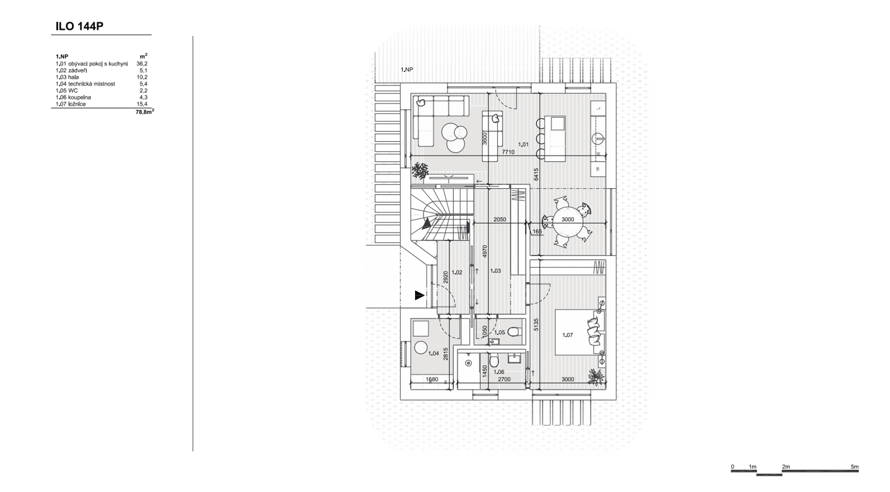 Dům spadá do kategorie větších a prostorově velkorysejších objektů. Zároveň je připraven pro posazení na netypicky orientované pozemky. Spodní podlaží je otevřeno do patra v místě jídelní části, kde vzniká efektní a lákavý prostor. Vstup je zasunutý pro maximální komfort. V rohu dispozice je umístěn pokoj, který může sloužit jako samostatný pokoj pro hosty se zázemím. Místnost je otevřena i do zahrady. V patře navazují pokoje na centrální chodbu, která je díky optickému propojení s přízemím působivým místem a ne jen obyčejným propojovacím prostorem. Ložnice v patře je doplněna pokojem, který může sloužit jako šatna nebo pracovna. Exteriér domu kombinuje dřevěný obklad nebo silikonovou omítku v dekoru dřeva lemující přízemí a klasickou omítku. Tato barevnost navazuje na střešní krytinu a vytváří osobitý vzhled domu.